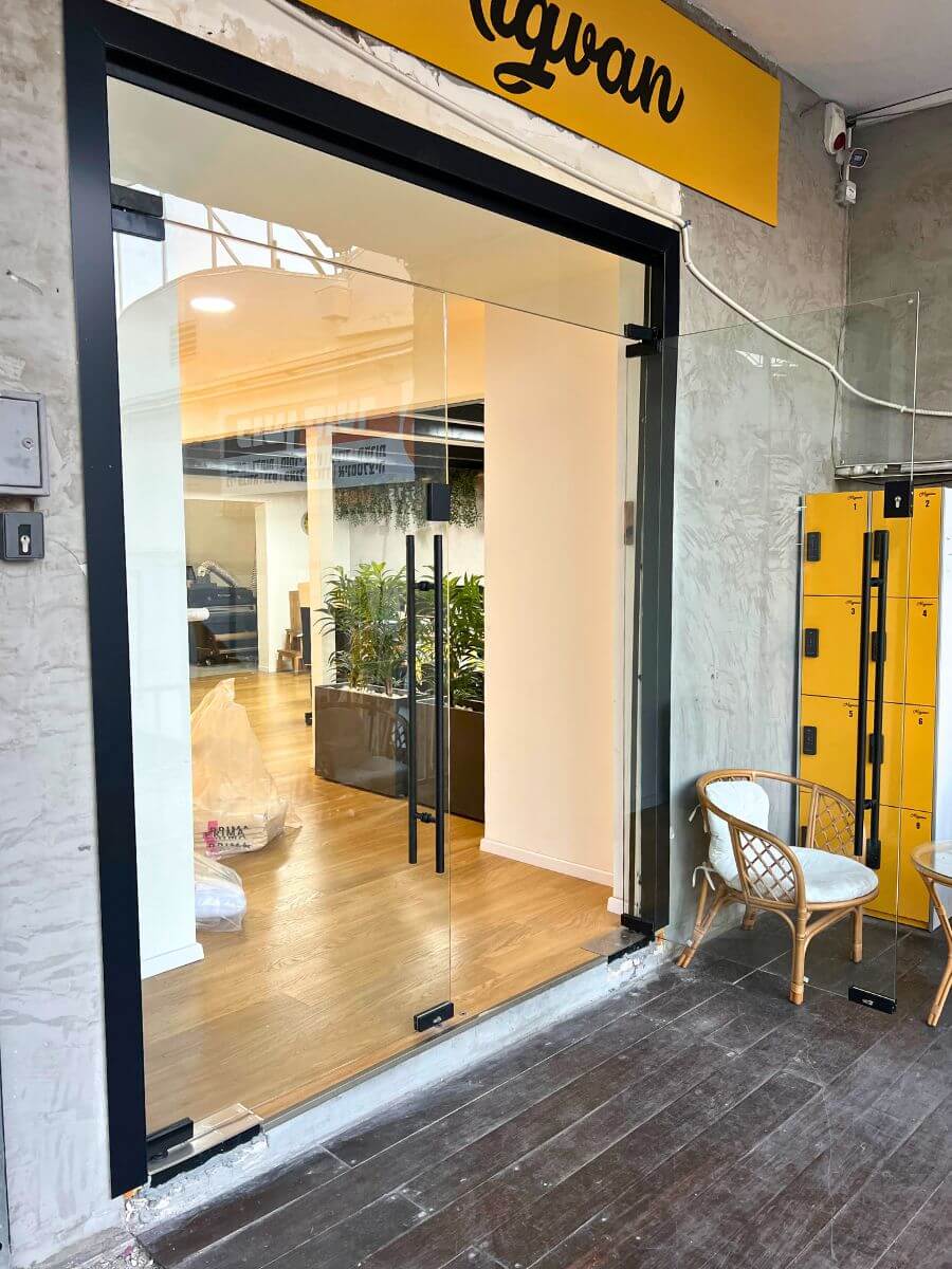 התקנת דלתות זכוכית לפתח החנות, כולל זכוכית קבועה עליונה, מסגרת ופרזול שחור בעיצוב מודרני.