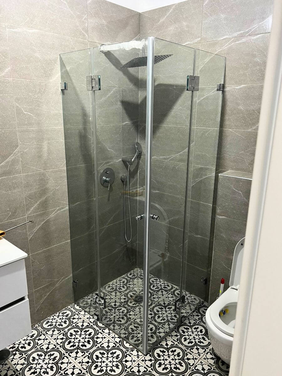 מקלחון בעיצוב יוקרתי בהתאמה אישית, עם שתי זכוכיות קבועות, שתי דלתות מתקפלות ופרזול ניקל מבריק.